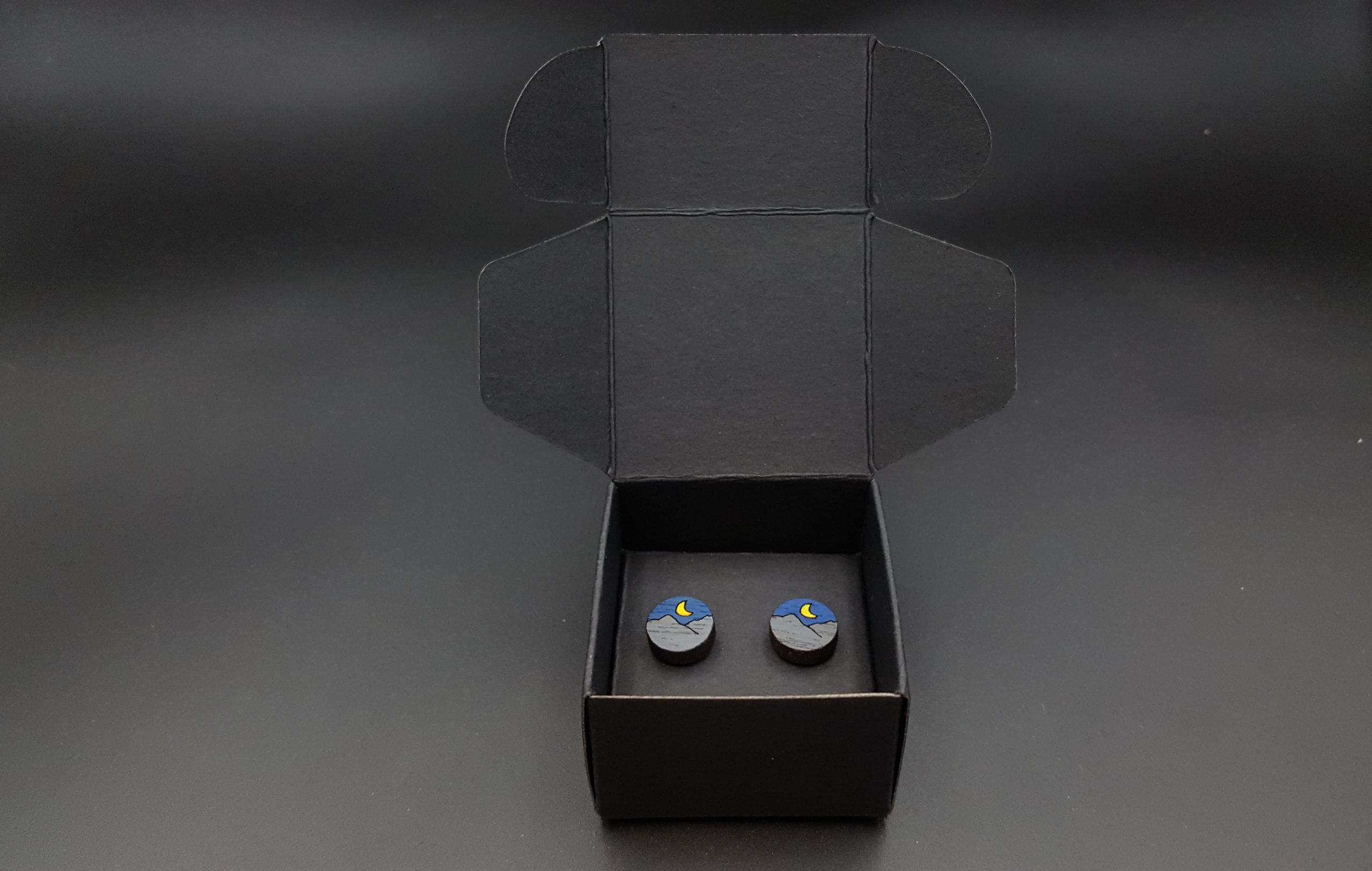 Kolczyki pakuję w kartonowe pudełeczko widoczne na zdjęciu.