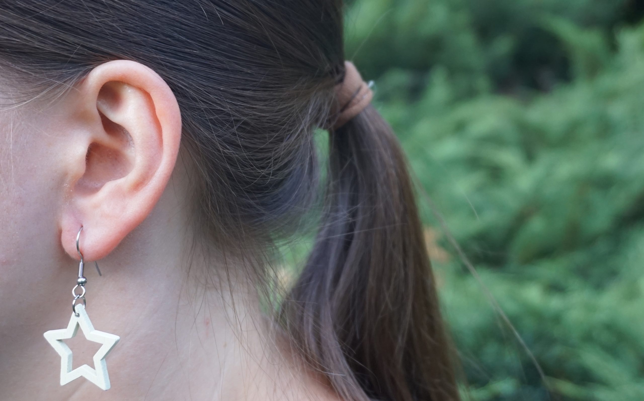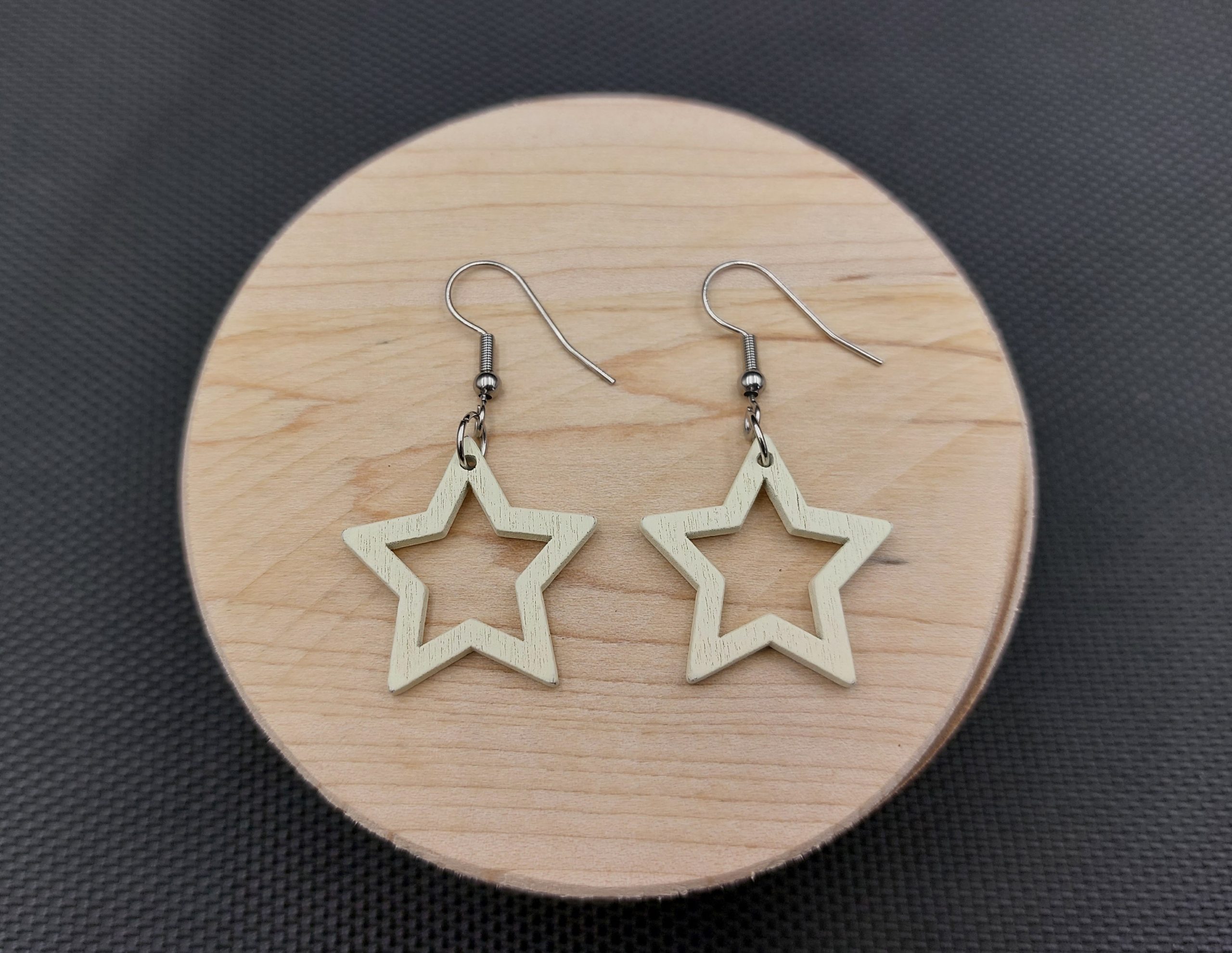 Wiszące drewniane kolczyki w kształcie gwiazdy.