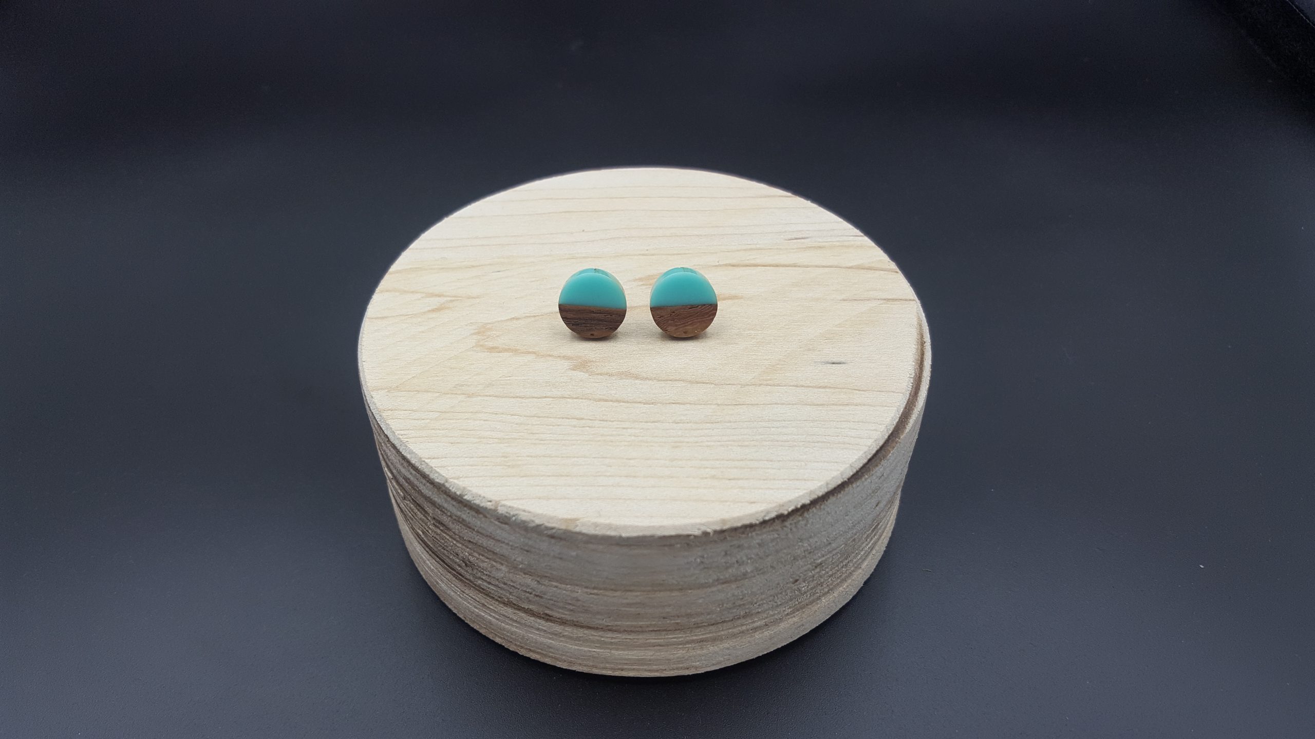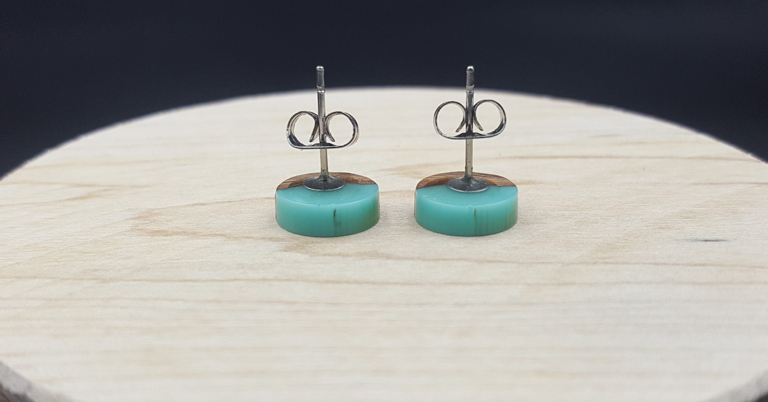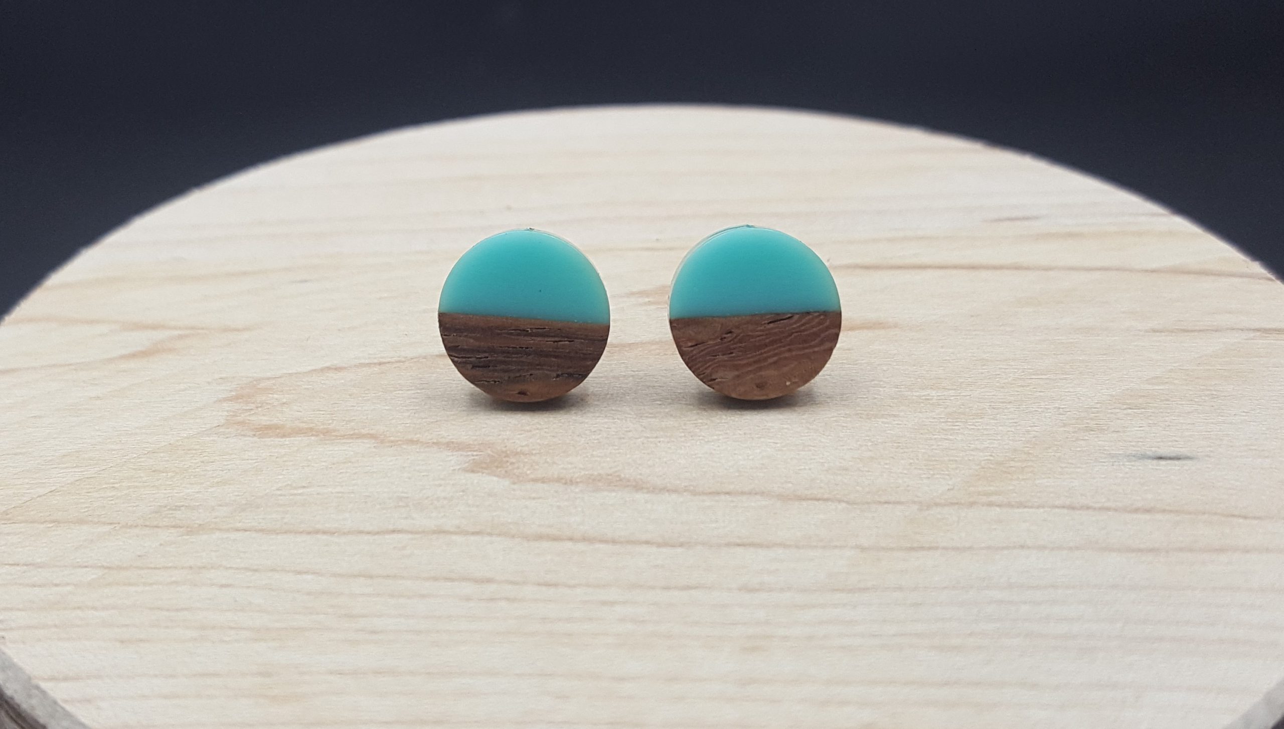Kółeczka drewniane z turkusową żywicą.