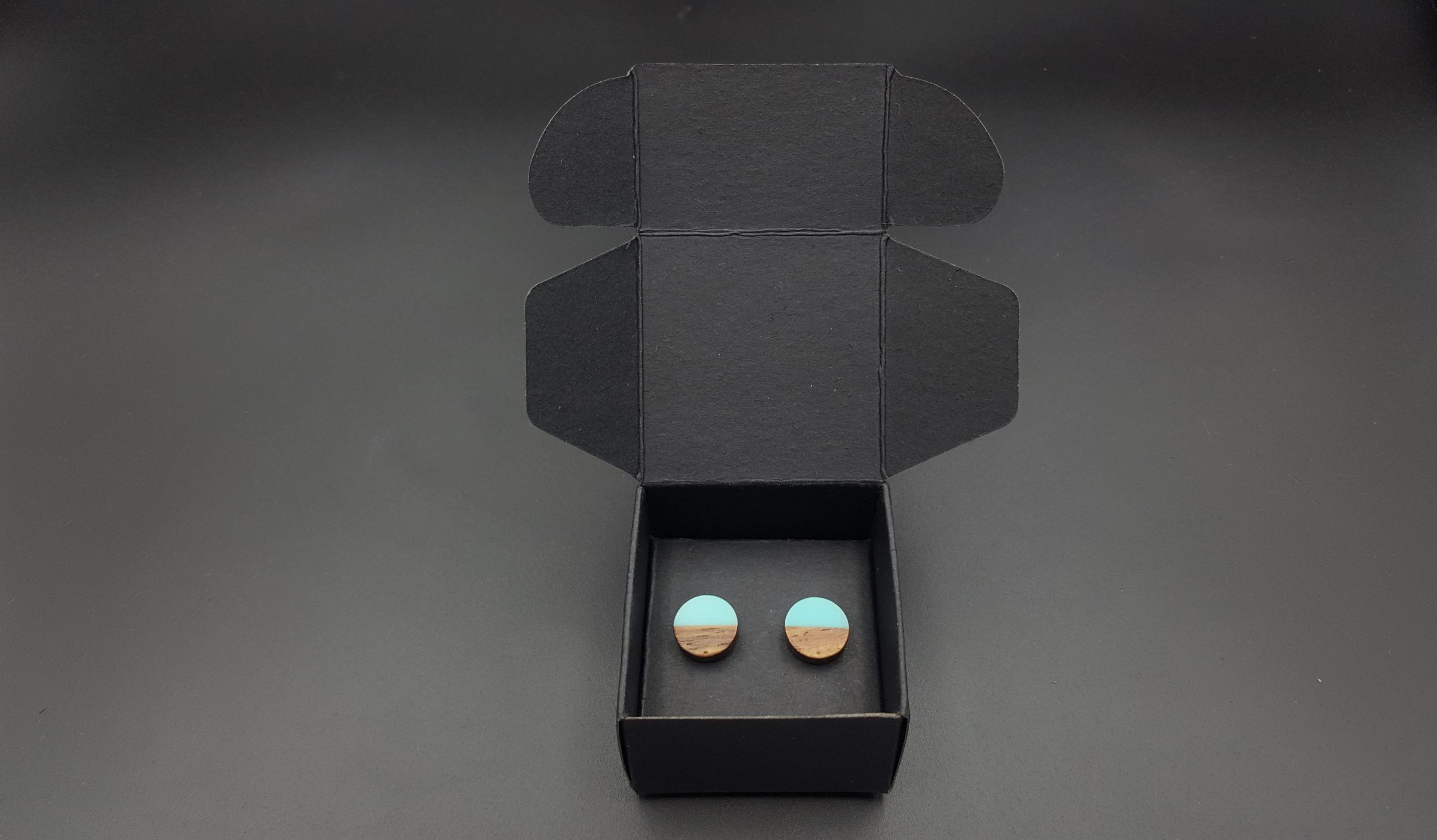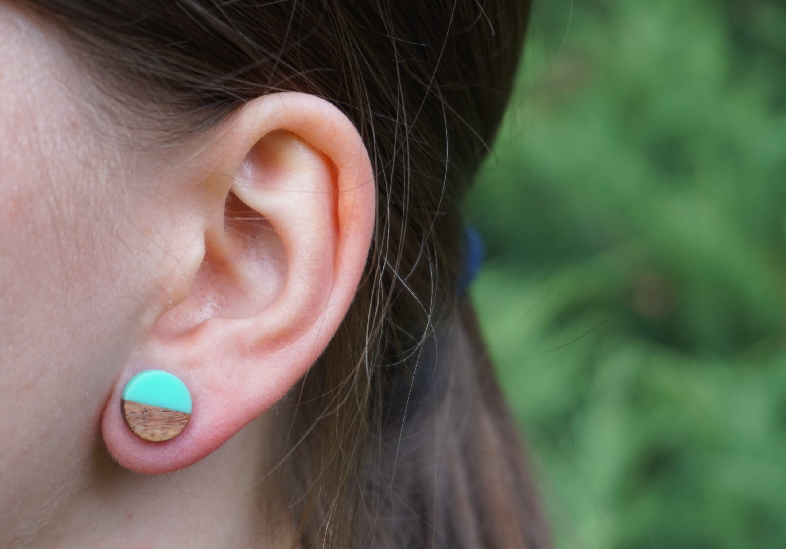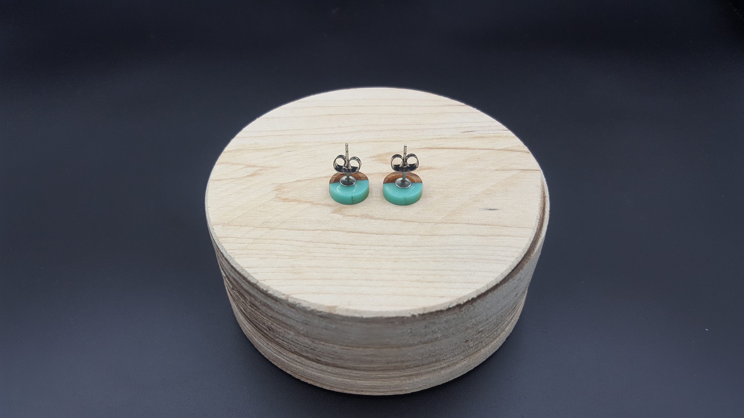 Kółeczka drewniane z turkusową żywicą.
