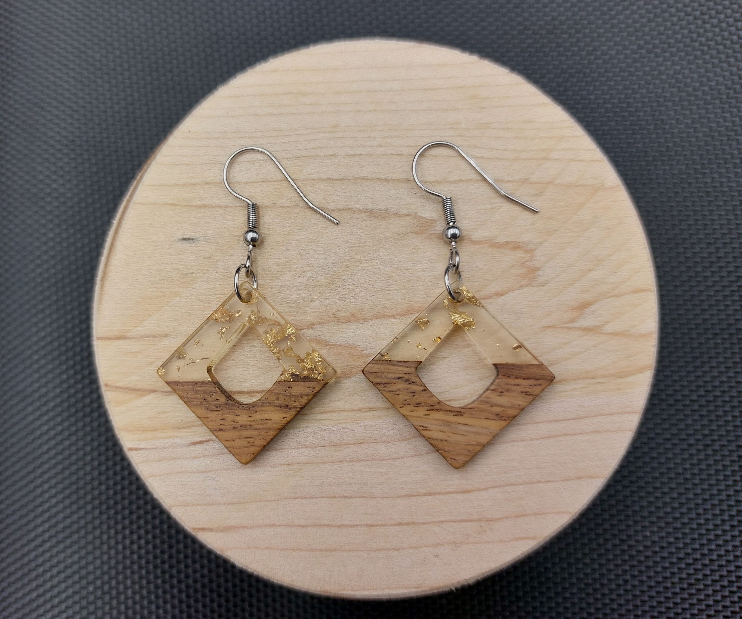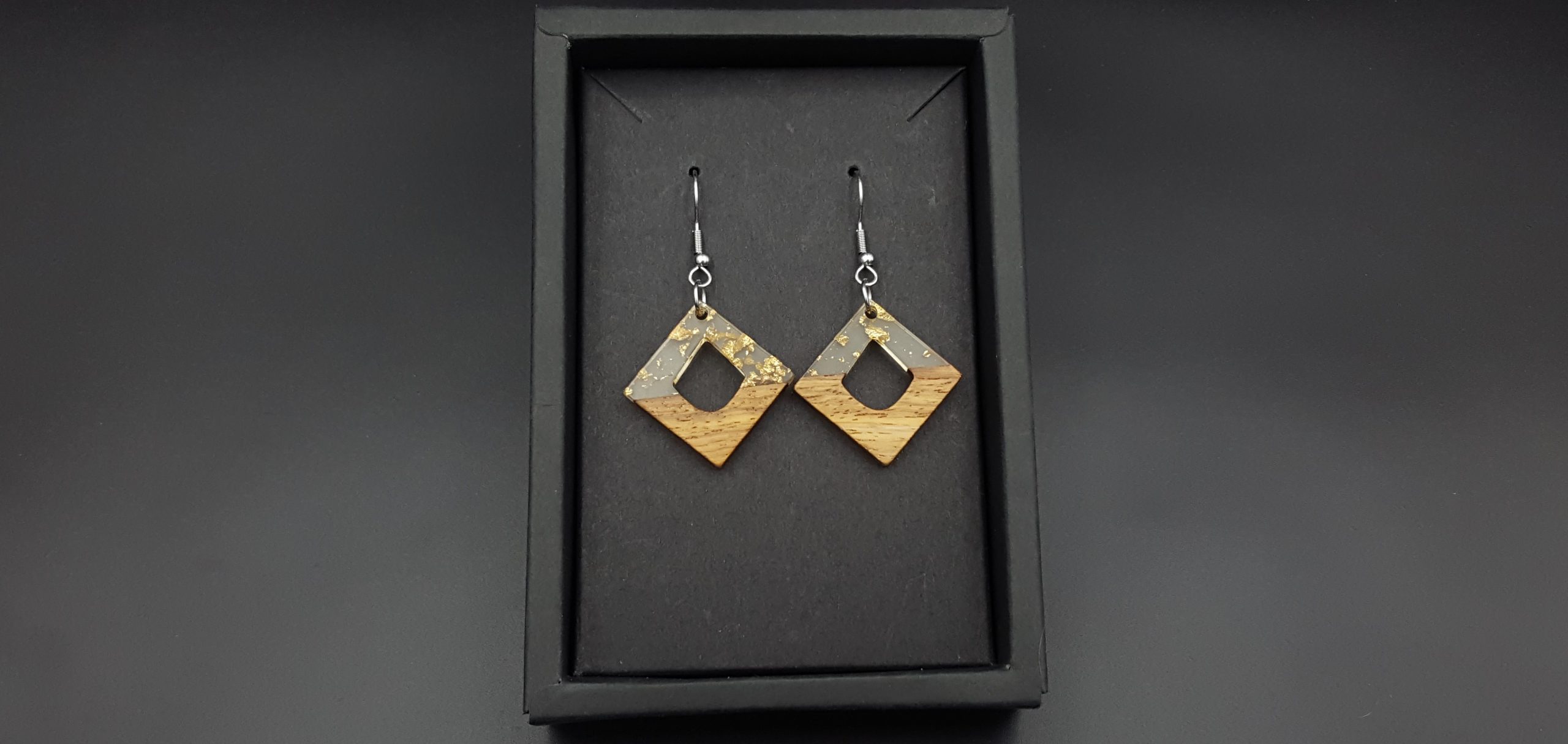 Kwadraty drewno + przezroczysta żywica ze złotymi drobinkami.
