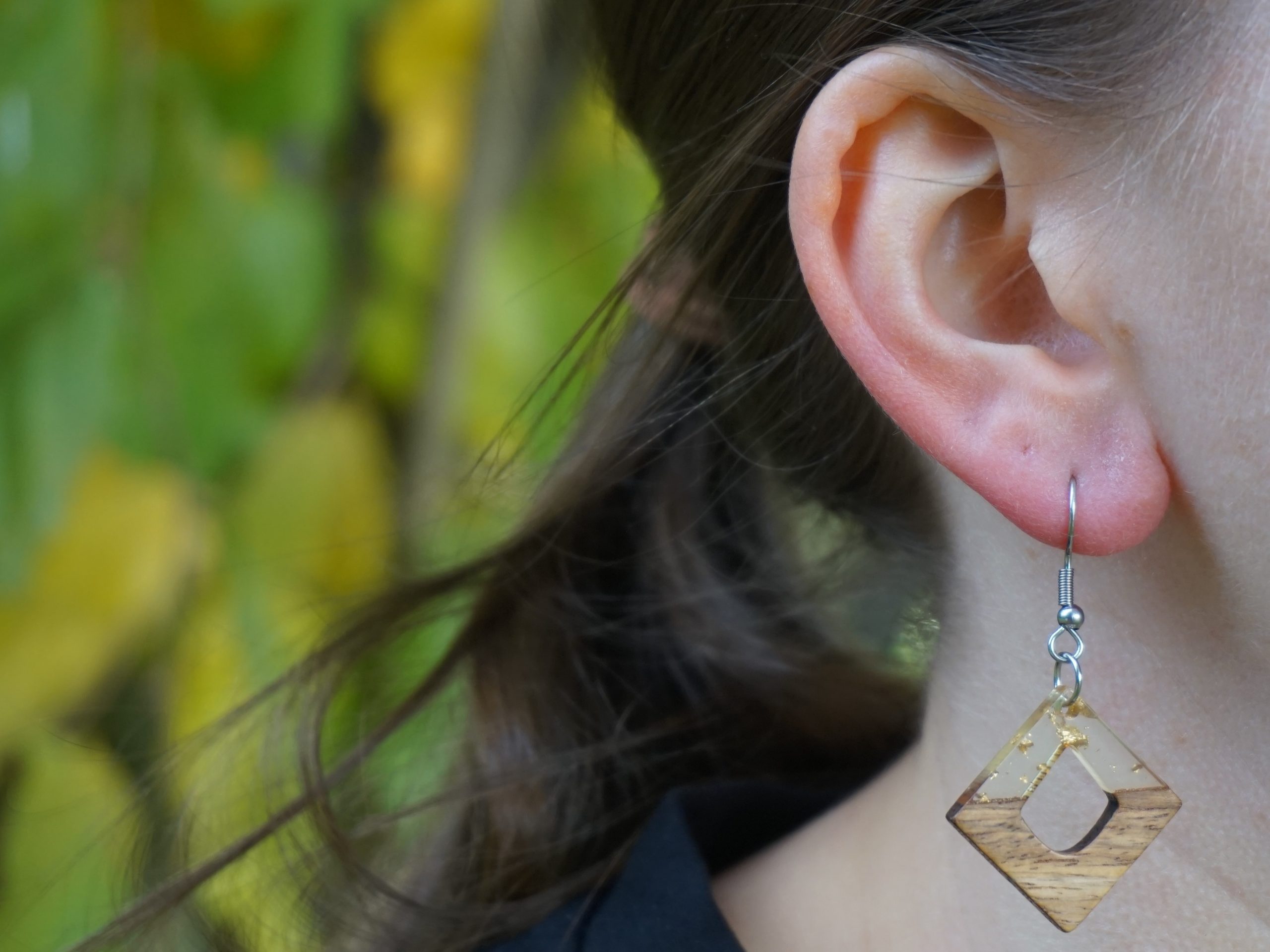 Każda para kolczyków powstaje z innego kawałka drewna, dlatego występują minimalne różnice w ich wyglądzie. Nie ma dwóch identycznych par. Dodatkowo kolory widoczne na zdjęciach mogą się nieco różnić od rzeczywistych ze względu na parametry ustawień monitora.