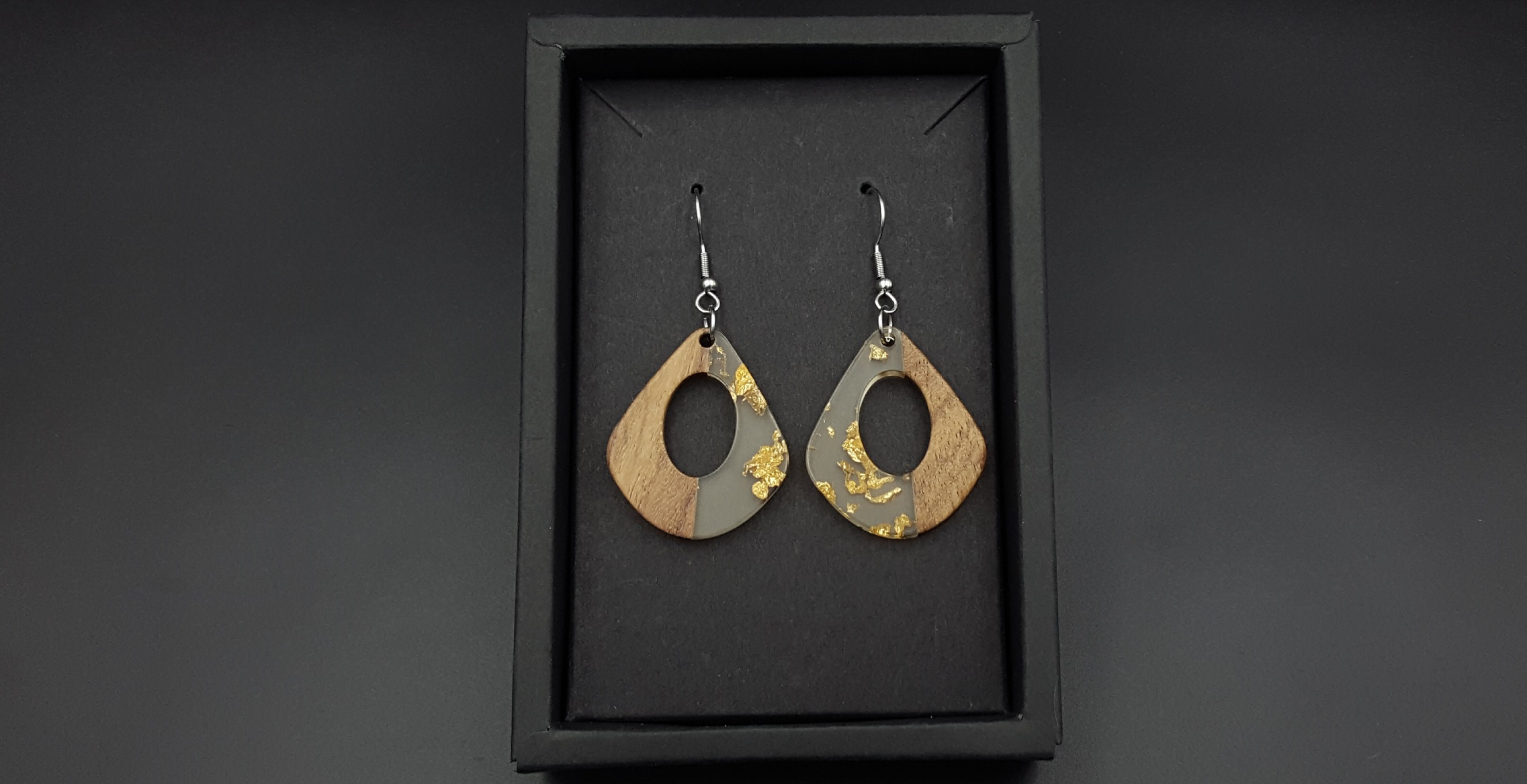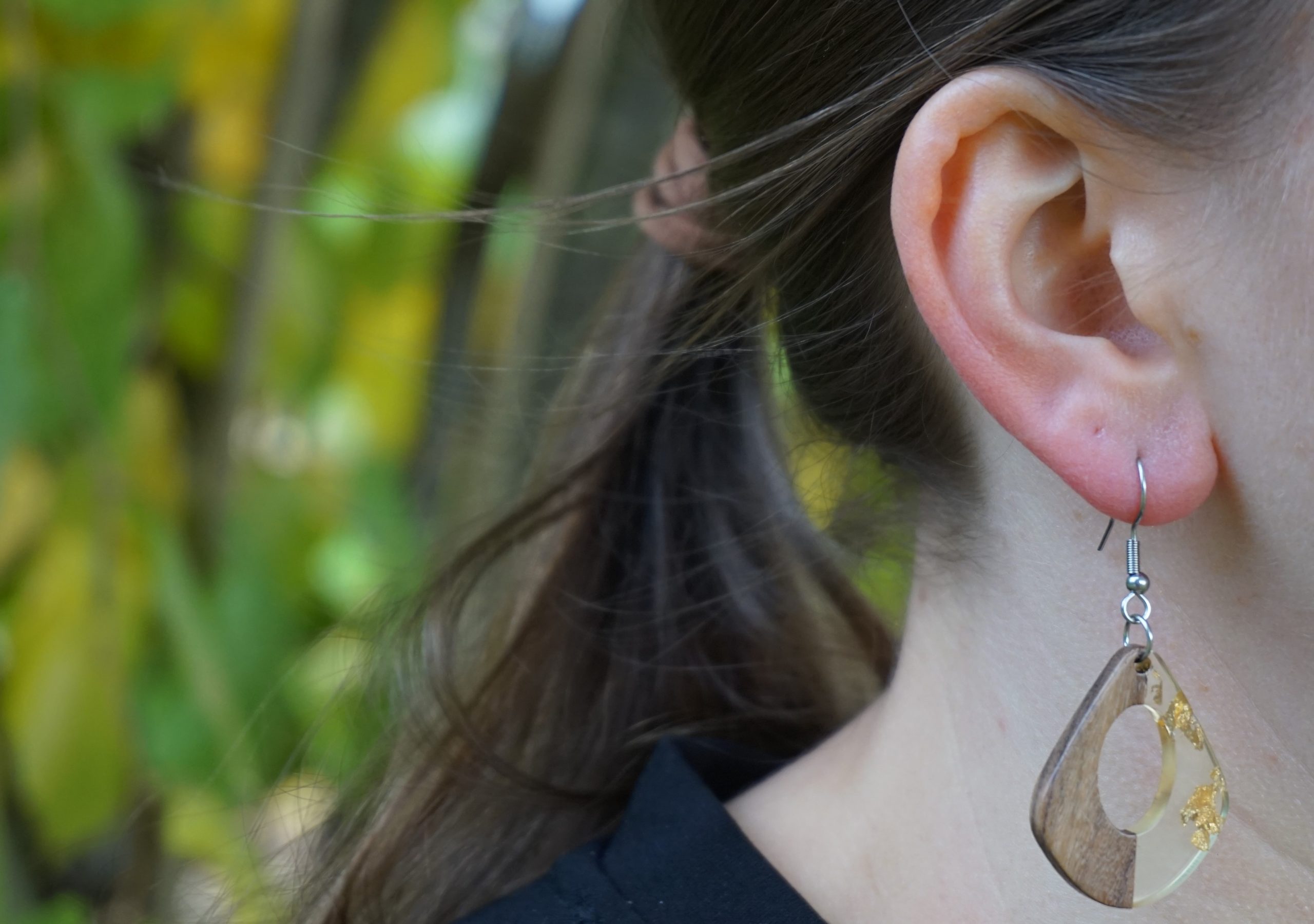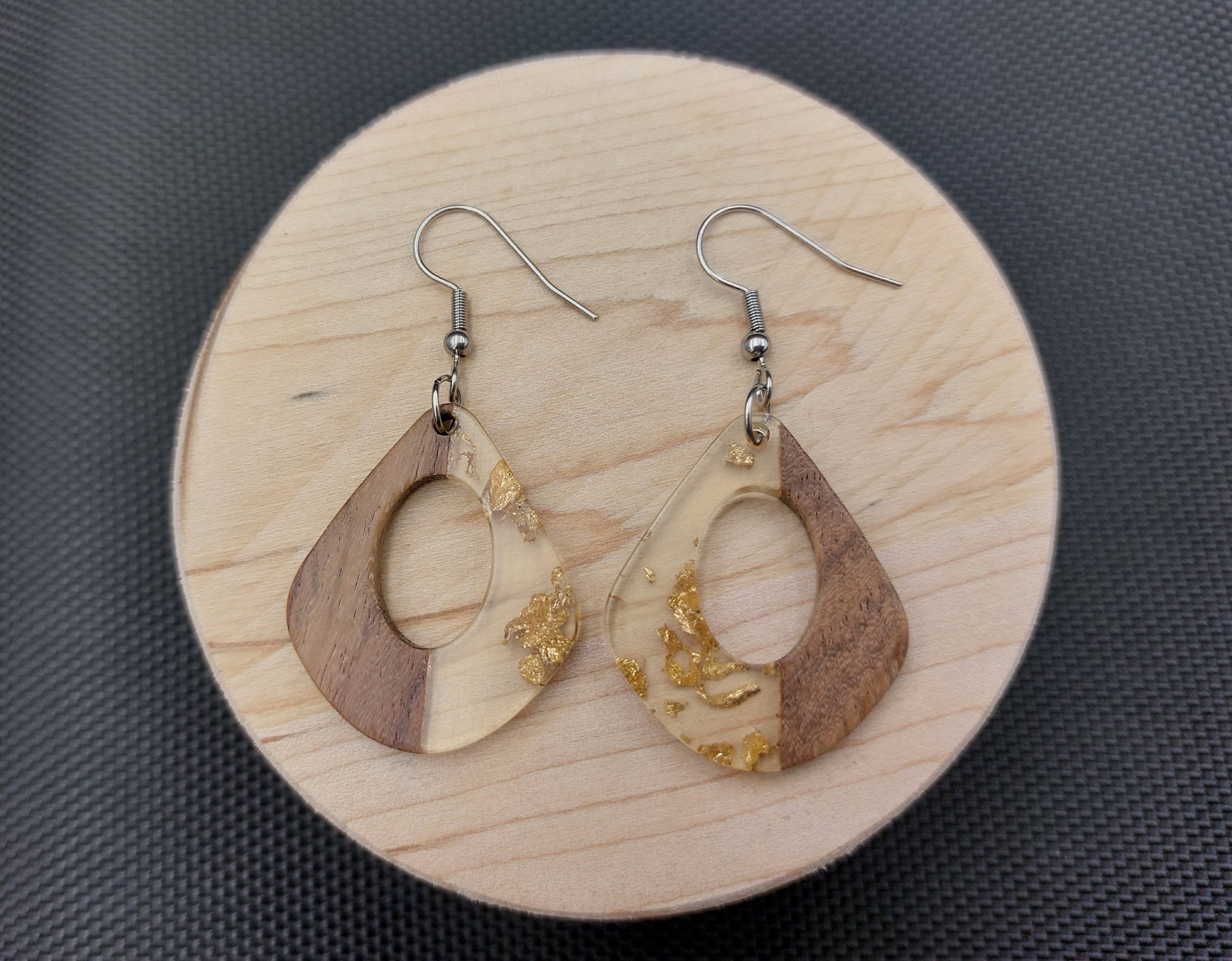 Łezki drewno + przezroczysta żywica ze złotymi drobinkami.