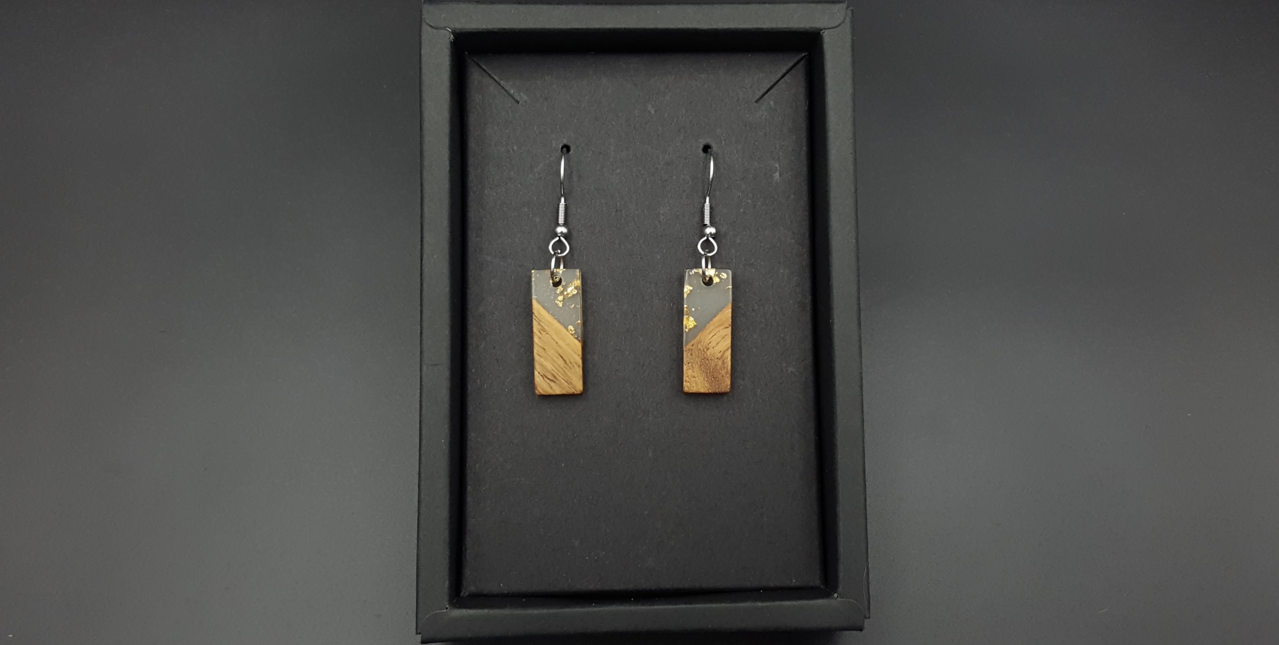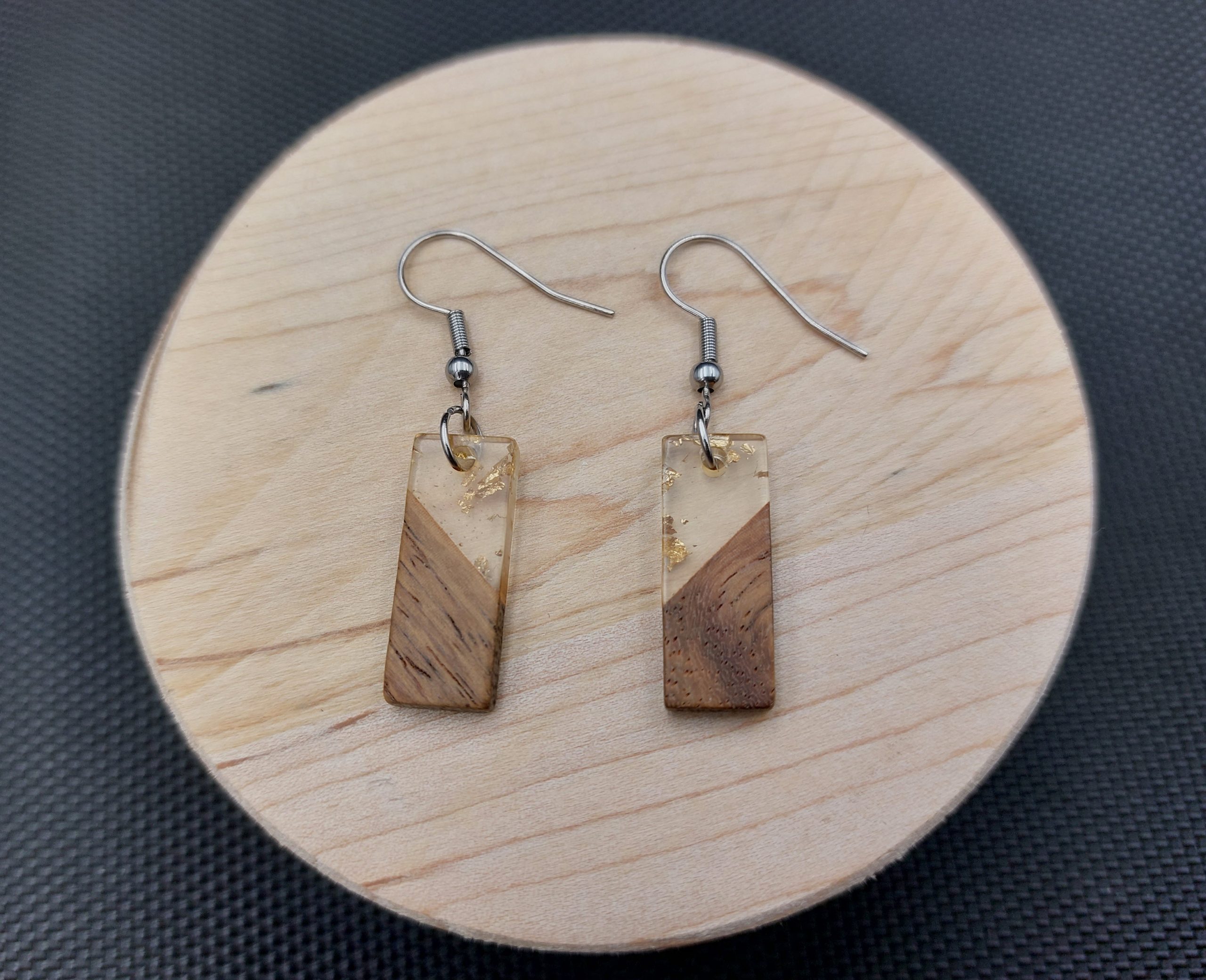 Prostokąty drewno + przezroczysta żywica ze złotymi drobinkami.