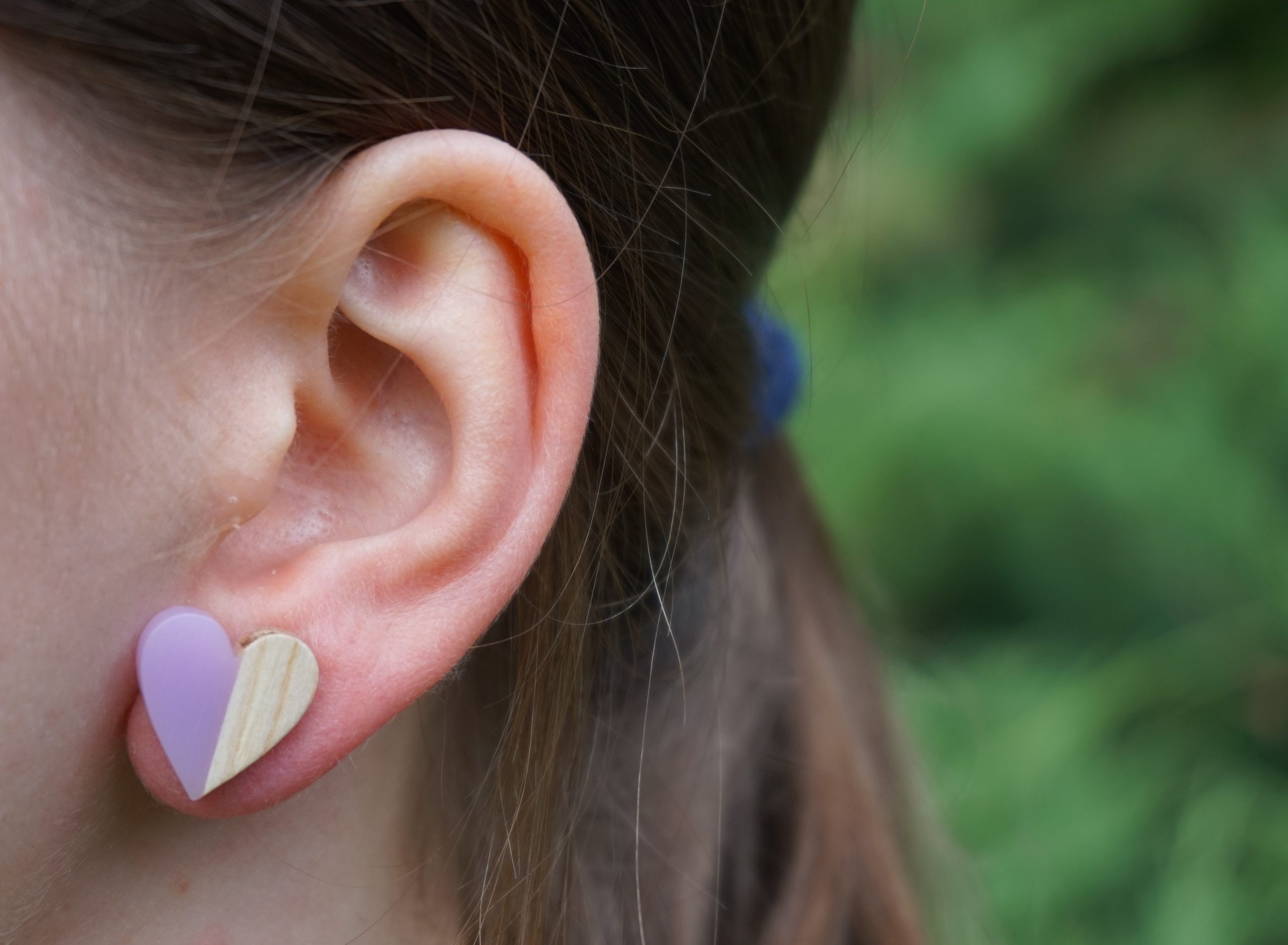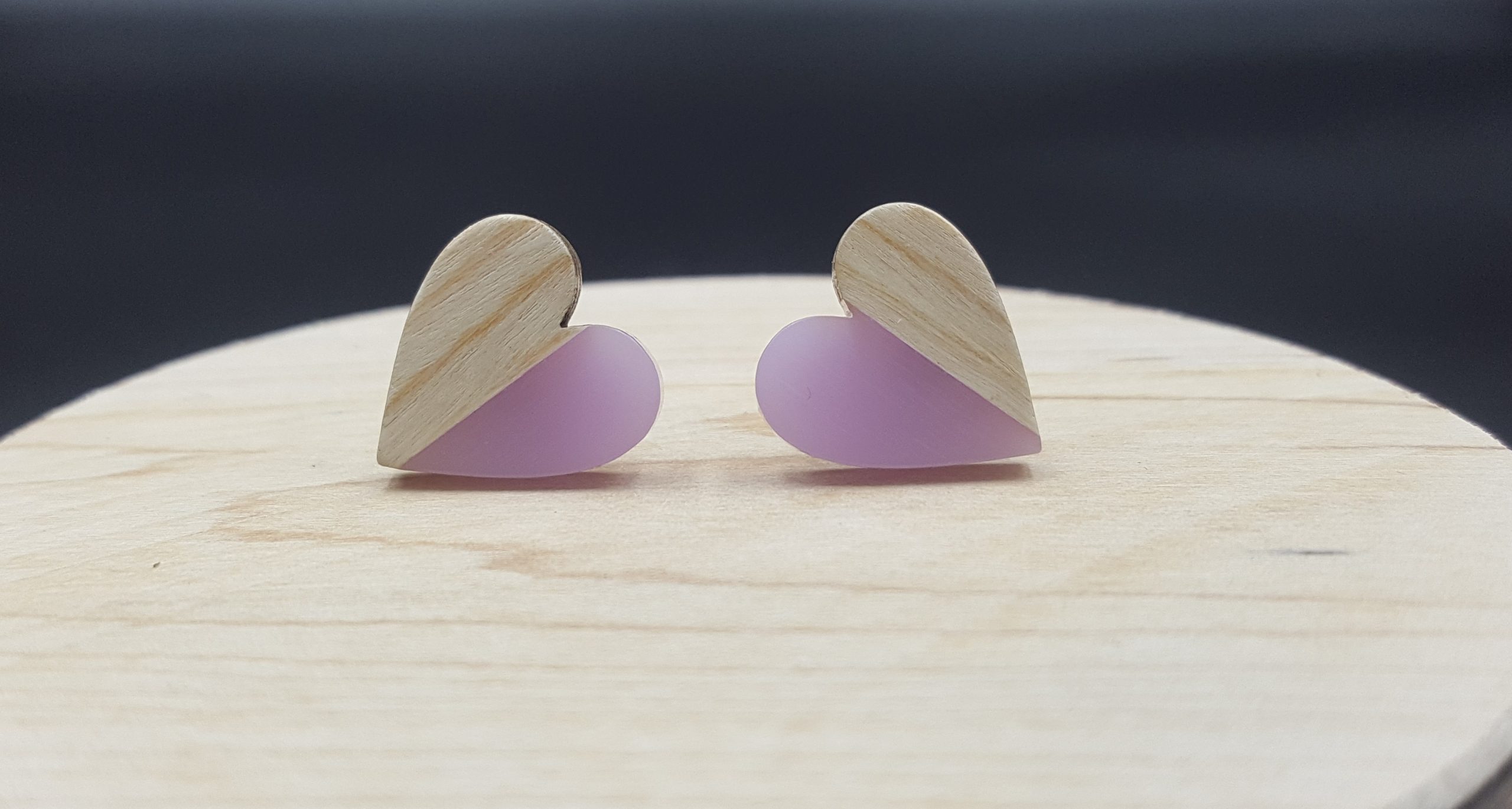 Serduszka drewniane z fioletową żywicą.