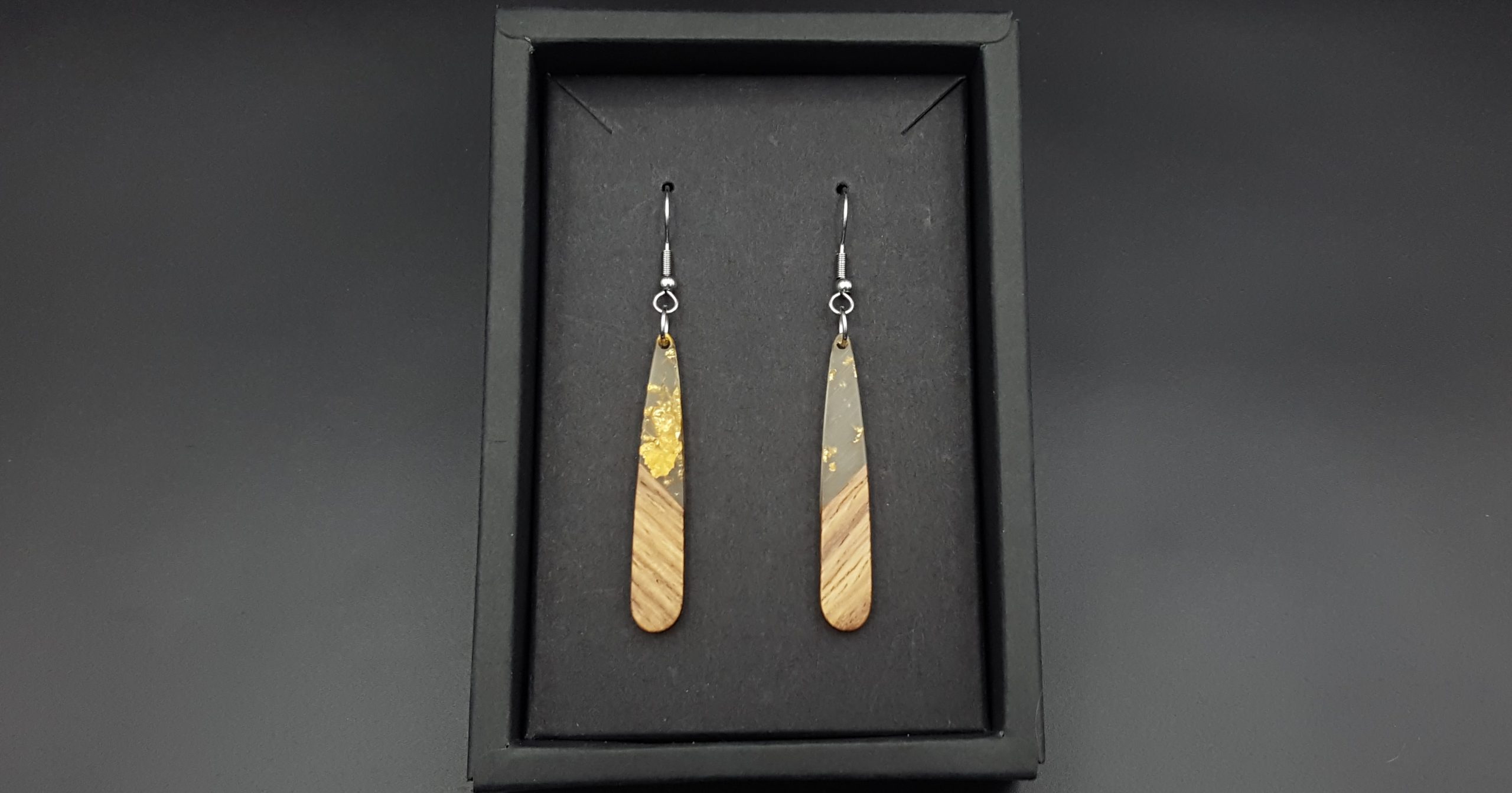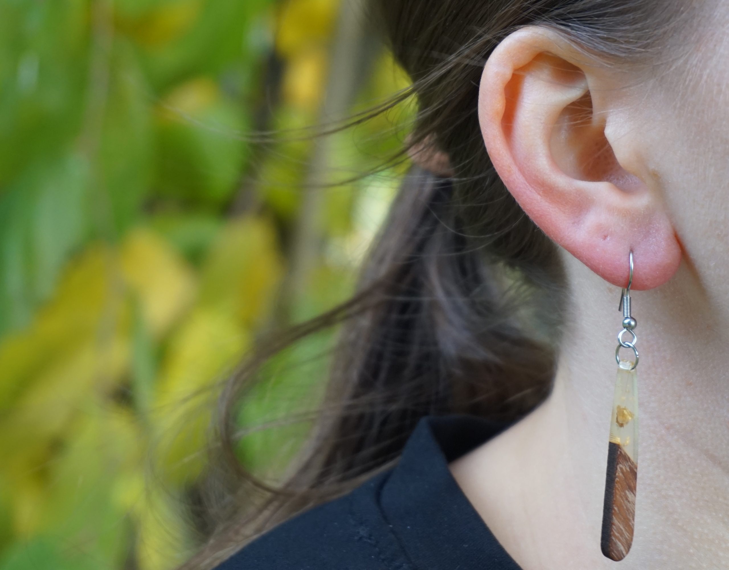 Sopelki drewno + przezroczysta żywica ze złotymi drobinkami.